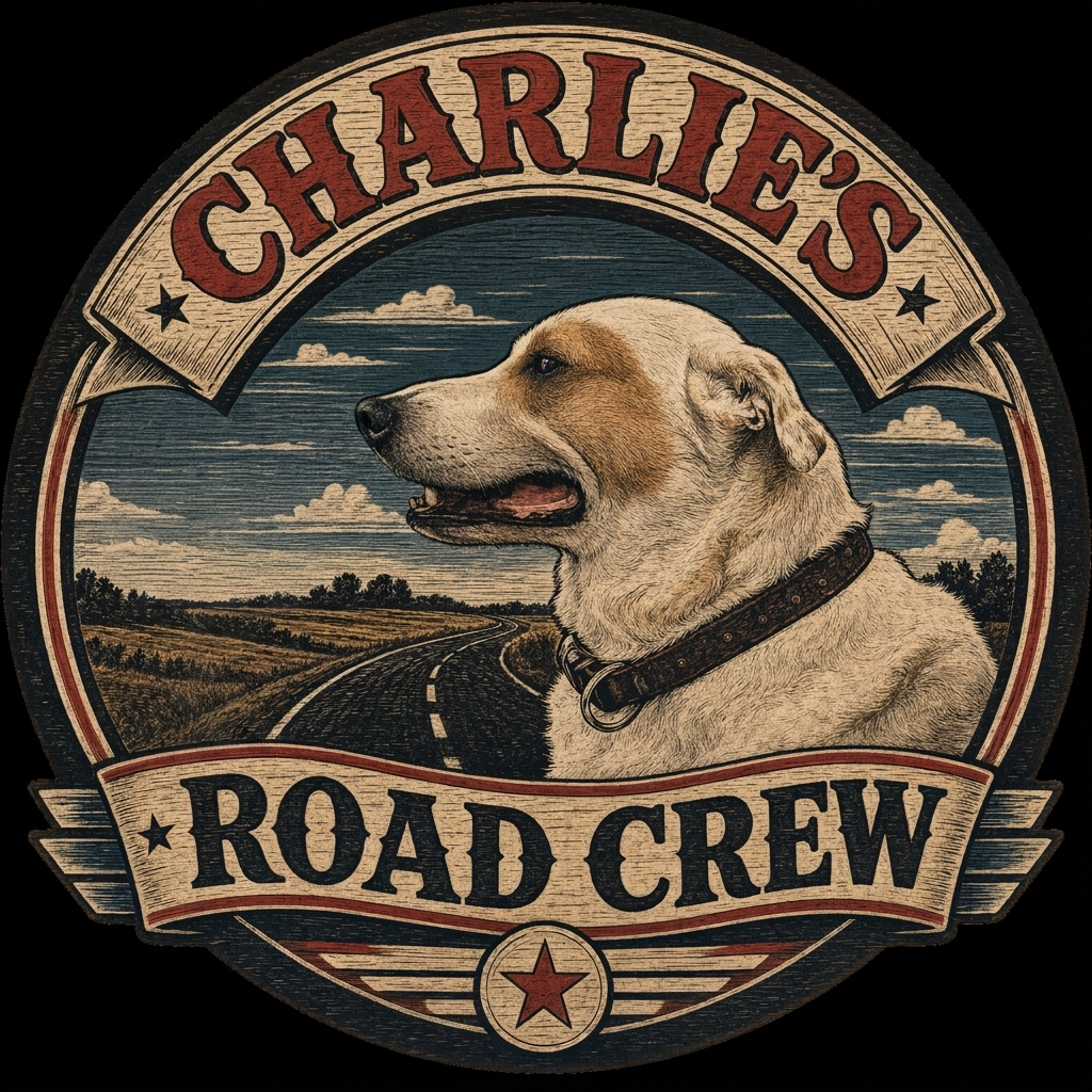 His name is Charlie. He's been road tripping with his dad Mike since the day he was adopted — raised on highway miles, rest stops, and the particular joy of a dog with his nose out the window at 65 mph.